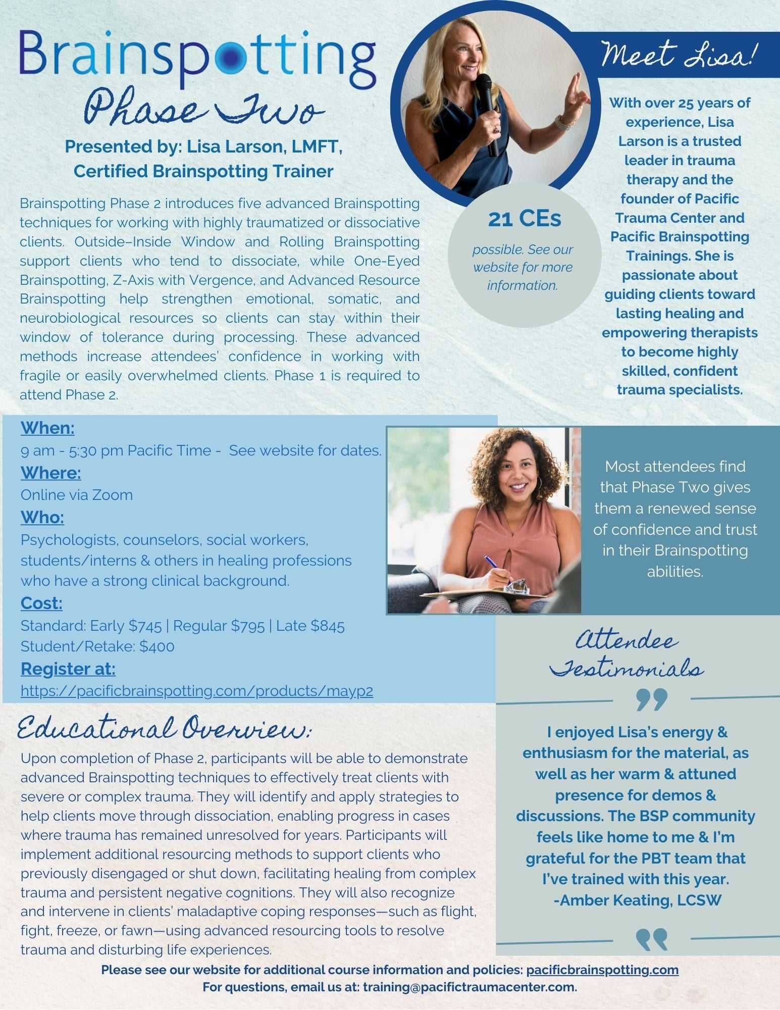 Brainspotting Phase 2 introduces five advanced Brainspotting techniques for working with highly traumatized or dissociative clients. Outside–Inside Window and Rolling Brainspotting support clients who tend to dissociate, while One-Eyed Brainspotting, Z-Axis with Vergence, and Advanced Resource Brainspotting help strengthen emotional, somatic, and neurobiological resources so clients can stay within their window of tolerance during processing. These advanced methods increase attendees’ confidence in working with fragile or easily overwhelmed clients. Phase 1 is required to attend Phase 2.