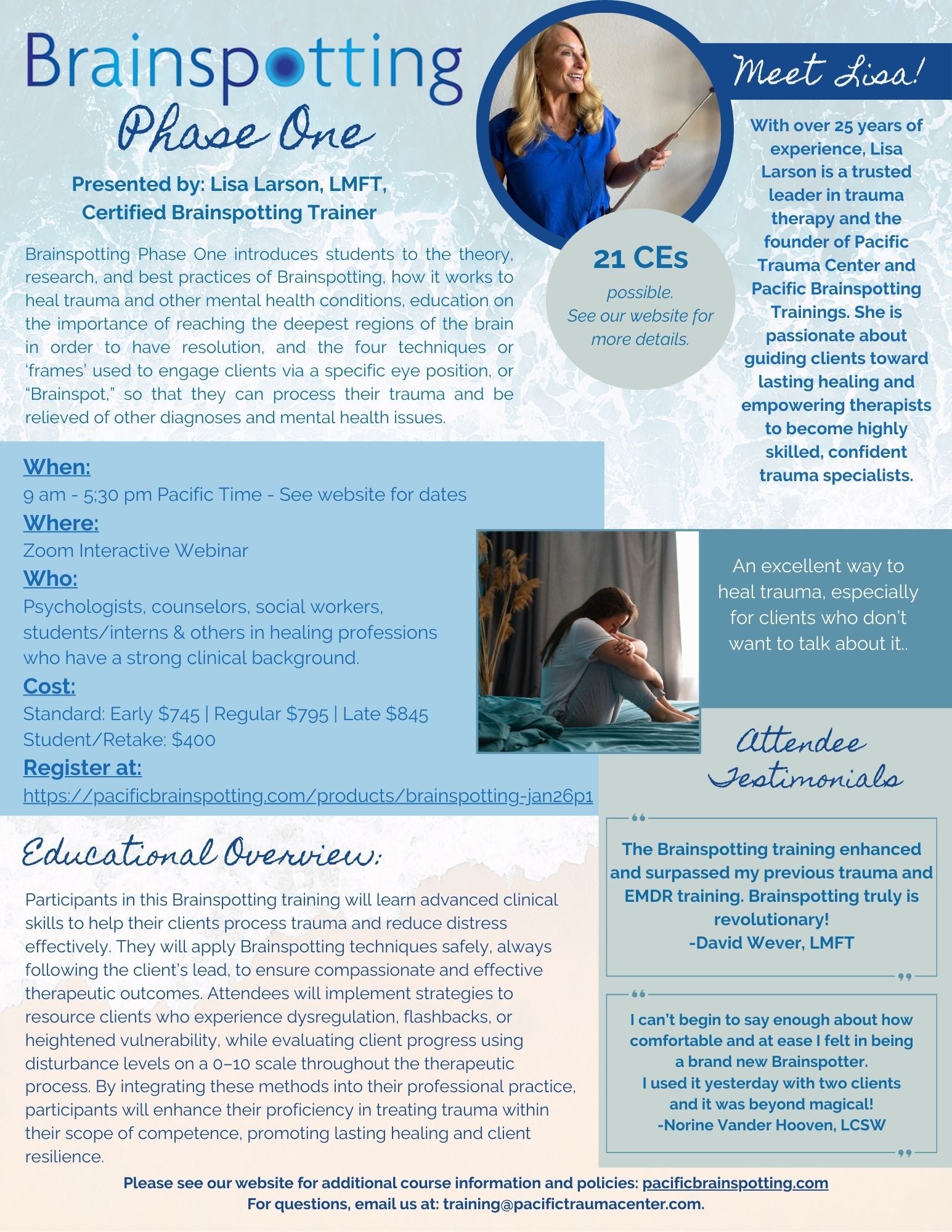 Brainspotting Phase One introduces students to the theory, research, and best practices of Brainspotting, how it works to heal trauma and other mental health conditions, education on the importance of reaching the deepest regions of the brain in order to have resolution, and the four techniques or ‘frames’ used to engage clients via a specific eye position, or “Brainspot,” so that they can process their trauma and be relieved of other diagnoses and mental health issues.
